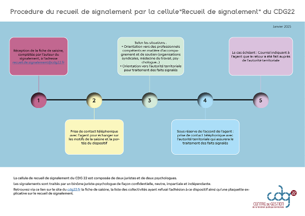 2 ans après sa mise en œuvre, voici un rappel schématisé de la procédure suivie par la cellule « Recueil de signalement » du CDG 22.